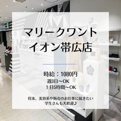 イオンモール旭川駅前 ファッション&コスメ販売 化粧品・アパレル雑貨の販売 コスメやファッション・アクセサリーなどの 多彩な商品をお客様にご案内するお仕事です。 ≪具体的には…≫◆お客様へコスメ、ファッション商品のご提案◆店舗のレイアウト変更◆商品や備品の補充◆店舗の清掃 etc. タッチアップの業務はないので 未経験の方でも安心してお仕事できます。 学生・フリーターなど20~30代中心に活躍中!! 将来、美容系や販売のお仕事に就きたい 学生さんも大歓迎♪ 職種コスメ&ファッション雑貨の販売 勤務地北海道 >旭川市 エントリー ELM ファッション&コスメ販売 化粧品・アパレル雑貨の販売 コスメやファッション・アクセサリーなどの 多彩な商品をお客様にご案内するお仕事です。 ≪具体的には…≫◆お客様へコスメ、ファッション商品のご提案◆店舗のレイアウト変更◆商品や備品の補充◆店舗の清掃 etc. タッチアップの業務はないので 未経験の方でも安心してお仕事できます。 学生・フリーターなど20~30代中心に活躍中!! 将来、美容系や販売のお仕事に就きたい 学生さんも大歓迎♪ 職種コスメ&ファッション雑貨の販売 勤務地青森県 >五所川原市 エントリー 札幌PARCO 💄マリークワントショップでの販売アルバイト💄 ⭐マリークワント・ショップスタッフ⭐ コスメやファッション・アクセサリーなどの 多彩な商品をお客様にご案内するお仕事です。 ≪具体的には…≫🔹お客様へコスメ、ファッション商品のご提案🔹店舗のレイアウト変更🔹商品や備品の補充🔹店舗の清掃 etc. タッチアップの業務はないので 未経験の方でも安心してお仕事できます。 \こんな方にオススメ/学生・フリーターなど20~30代中心に活躍中!! 将来、美容系や販売のお仕事に就きたい 学生さんも大歓迎♪ 職種コスメ&ファッション雑貨の販売 勤務地北海道 >札幌市(札幌PARCO) エントリー イオン帯広店 💄マリークワントショップでの販売アルバイト💄 ⭐マリークワント・ショップスタッフ⭐ コスメやファッション・アクセサリーなどの 多彩な商品をお客様にご案内するお仕事です。 ≪具体的には…≫🔹お客様へコスメ、ファッション商品のご提案🔹店舗のレイアウト変更🔹商品や備品の補充🔹店舗の清掃 etc. タッチアップの業務はないので 未経験の方でも安心してお仕事できます。 \こんな方にオススメ/学生・フリーターなど20~30代中心に活躍中!! 将来、美容系や販売のお仕事に就きたい 学生さんも大歓迎♪ 職種コスメ&ファッション雑貨の販売 勤務地北海道 >帯広市 エントリー うすい百貨店 ファッション&コスメ販売 化粧品・アパレル雑貨の販売 コスメやファッション・アクセサリーなどの 多彩な商品をお客様にご案内するお仕事です。 ≪具体的には…≫◆お客様へコスメ、ファッション商品のご提案◆店舗のレイアウト変更◆商品や備品の補充◆店舗の清掃 etc. タッチアップの業務はないので 未経験の方でも安心してお仕事できます。 学生・フリーターなど20~30代中心に活躍中!! 将来、美容系や販売のお仕事に就きたい 学生さんも大歓迎♪ 職種コスメ&ファッション雑貨の販売 勤務地福島県 >郡山市 エントリー さくら野百貨店八戸店 ファッション&コスメ販売 化粧品・アパレル雑貨の販売 コスメやファッション・アクセサリーなどの 多彩な商品をお客様にご案内するお仕事です。 ≪具体的には…≫◆お客様へコスメ、ファッション商品のご提案◆店舗のレイアウト変更◆商品や備品の補充◆店舗の清掃 etc. タッチアップの業務はないので 未経験の方でも安心してお仕事できます。 学生・フリーターなど20~30代中心に活躍中!! 将来、美容系や販売のお仕事に就きたい 学生さんも大歓迎♪ 職種コスメ&ファッション雑貨の販売 勤務地青森県 >八戸市 エントリー 丸井今井函館 💄マリークワントショップでの販売アルバイト💄 ⭐マリークワント・ショップスタッフ⭐ コスメやファッション・アクセサリーなどの 多彩な商品をお客様にご案内するお仕事です。 ≪具体的には…≫🔹お客様へコスメ、ファッション商品のご提案🔹店舗のレイアウト変更🔹商品や備品の補充🔹店舗の清掃 etc. タッチアップの業務はないので 未経験の方でも安心してお仕事できます。 \こんな方にオススメ/学生・フリーターなど20~30代中心に活躍中!! 将来、美容系や販売のお仕事に就きたい 学生さんも大歓迎♪ 職種コスメ&ファッション雑貨の販売 勤務地北海道 >函館市 エントリー エスパル仙台店 💄マリークワントショップでの販売アルバイト💄 ⭐マリークワント・ショップスタッフ⭐ コスメやファッション・アクセサリーなどの 多彩な商品をお客様にご案内するお仕事です。 ≪具体的には…≫🔹お客様へコスメ、ファッション商品のご提案🔹店舗のレイアウト変更🔹商品や備品の補充🔹店舗の清掃 etc. タッチアップの業務はないので 未経験の方でも安心してお仕事できます。 \こんな方にオススメ/学生・フリーターなど20~30代中心に活躍
